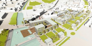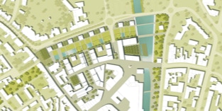 Das städtebauliche Ziel des Entwurfs ist die Ausbildung einer Stadtkante zum historischen Wallgraben mit Durchlässigkeit zu neuen Grünalnlegen. Die Wohnhäuser ziehen die Wall-Graben-Zone in ihre Innenhöfe. Zur Stadt orientiert entstehen Geschäfte und Restaurants.