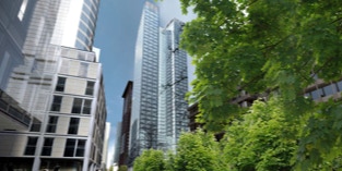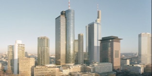 Standort des Wettbewerbs ist das Areal um die Neue Mainzer Strasse. Das altehrwürdige Frankfurter Bankenviertel bildet heute das Zentrum der in Europa einmaligen Skyline. Der Turm ist 175 m hoch und vorrangig durch die Wirkung zweier schmaler Scheiben geprägt. Unterschiedlich breite, konische Schlitze verstärken die Schlankheit zusätzlich. Der Baukörper öffnet sich auf der Nord-Ost-Seite zur Plaza - entsprechend erfolgt von hier auch die Haupterschliessung.