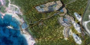 Im darunterliegenden Gelände befinden sich Luxus-Appartements und Villen, die sich in Terrassen den Hang hinunterschlängeln und von einer Aktivitätsachse durchbrochen werden. Die Achse selbst ist durch eine Seilbahn, einem Erlebnisweg und Bachlauf definiert und führt vom Mountain-Village an der oberen Zufahrtsstraße über ein Sport-Cluster in der Mitte zum Beach Village am Strand und endet dort in einem Strand-Pool. Entlang dieser Achse liegen Sport- und Wellnesaktivitäten sowie Gastronomieangebote.