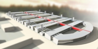 Der Hochbaubereich wurde mit Werkstätten, Verwaltungsgebäuden und Empfangszentrale so geplant, dass Besucher und Testbetrieb durchgehend auf zwei Ebenen getrennte Bereiche erhaltenen, damit sensible Informationen geschützt werden können.